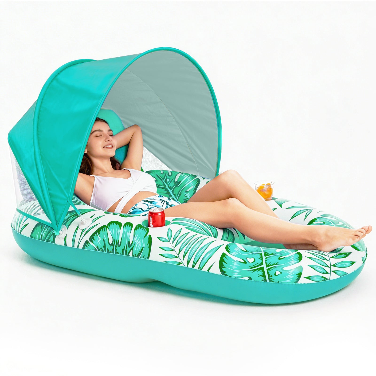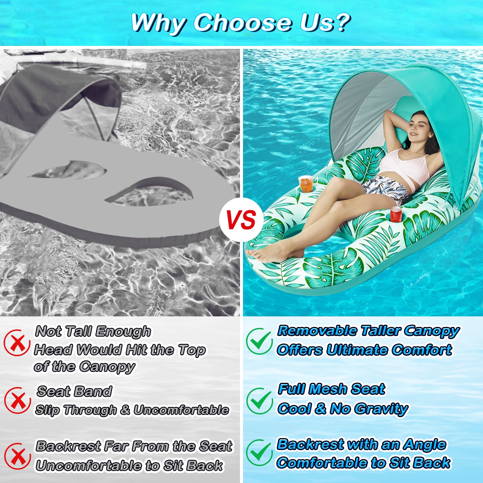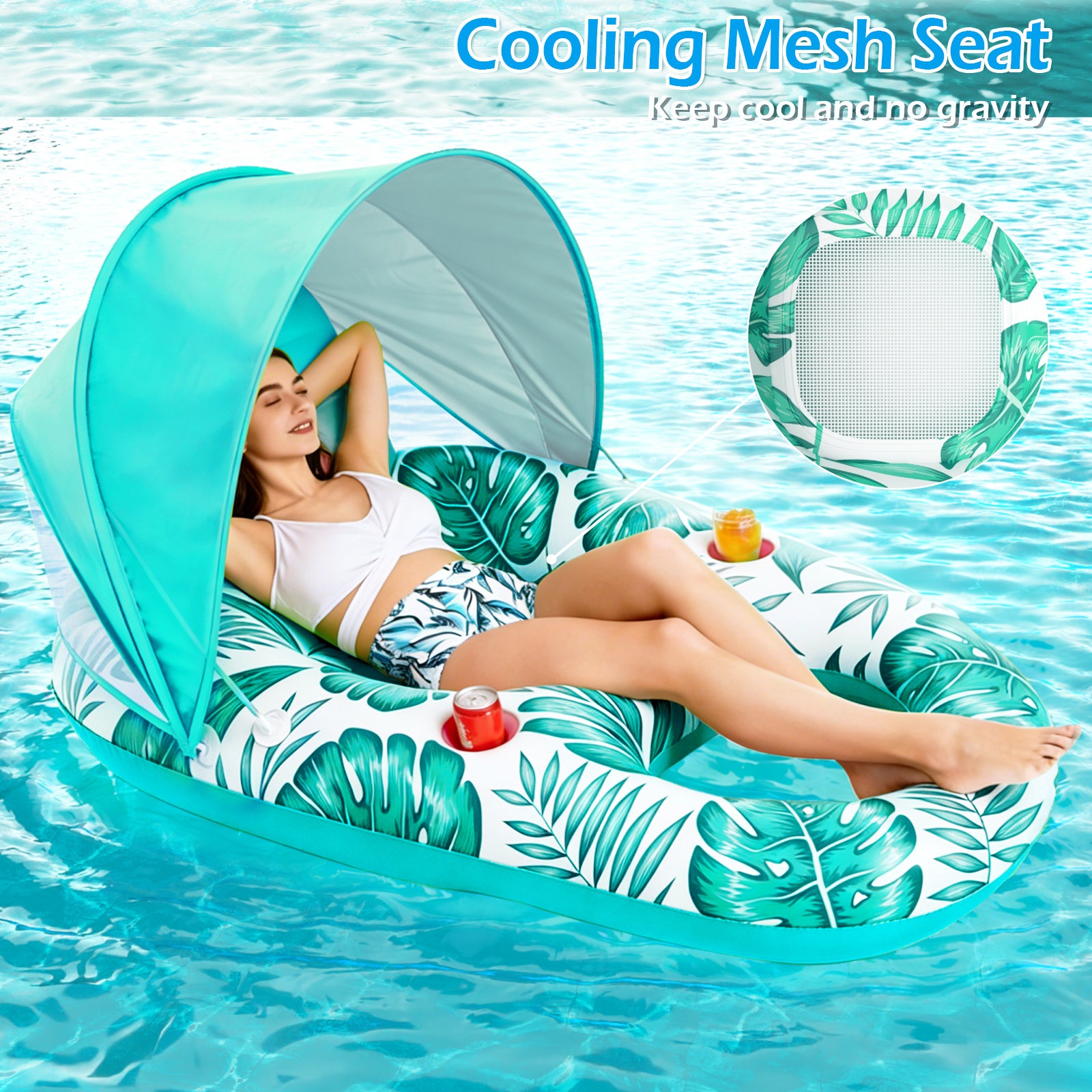 - Inflatable Pool Float with Taller & Removable Sun Canopy - The canopy is taller, offers a better view and ultimate comfort. Well-ventilated and UPF50, has great airflow to stay cool and comfortable. Thicker support poles for enhanced stability. Patent pending design.